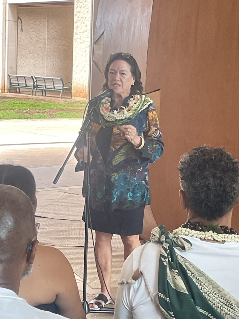 The artist Meleanna Aluli Meyer, who designed the ʻUmeke Lāʻau, speaks at the closing ceremony in ‘Ewa.